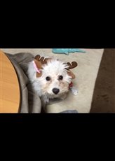メルはトナカイの帽子を着て、クリスマスの贈りものを口いっぱいにして喜んでいます。